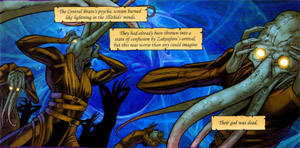 Drizzt had his first encounter with these creatures during his adventures in the Underdark with Belwar Dissengulp and Clacker. Drizzt was captured by them and thier psionic powers and taken to their city as a slave. While being hunted by a dead Zaknafein who was possessed by Lolth's Spirit Wraith and being controlled by Matron Malice. The Mind Flayers failed at controlling Guenhwyvar and the great cat created a huge amount of chaos in the city looking for Drizzt and killing thier god, freeing Drizzt, Belwar and Clacker from their trance. Zaknafein also played a part, since being dead, would not succomb to the Mind Flayers and killed them in numerous quantities in his pursuit of Drizzt.